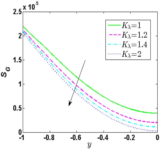 Figure 6 provides the change of the local entropy generation for different values of Kλ. We can observe from Figure 6 that the entropy generation grows from the center axis to the wall of soft nanochannels and has a minimum at the centerline of soft nanochannels. In addition, the entropy generation rate drops as growth of Kλ. In other words, growth of Kλ can reduce the irreversibility of the fluids.