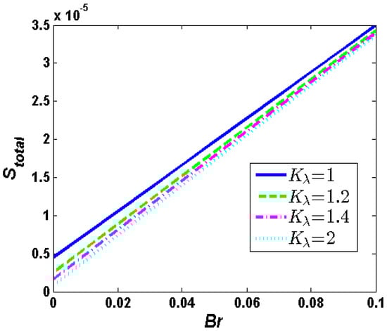 The influence of Brinkmann number Br on the total entropy generation rate throughout entire soft nanochannels has been depicted in Figure 7. It can be seen from Figure 7 that the total entropy generation rate obviously increases with Br. That is to say, an enhancement of viscous dissipation effect leads to the enhancement of the fluidic irreversibility. In this case, the viscous dissipation plays a crucial role.
