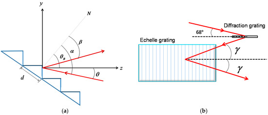 where m, λ, and d are the diffraction order, wavelength, and grating constant, respectively. α, β and γ are the incident angle, corresponding diffraction angle, and off-axis angle. As shown in Figure 1a, θB is the blaze angle of an echelle grating and θ is the incident angle to the facet. So, the relation of angles is written as: