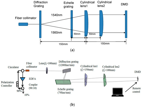 Figure 3 demonstrates the tunable laser structure employing a DMD chip as a programmable filter in bulk optics and a fiber resonator with an erbium-doped fiber amplifier (EDFA). The lasing process in a fiber cavity is achieved by optical pumping and erbium gain. The bulk optics obtain the high-precision mode selection by an echelle grating and a 0.55″ DMD in the experiment. The detailed working principle of a 0.55″ DMD and its diffraction efficiency have been analyzed in [13]. The EDFA emits the amplified spontaneous emission spectrum (ASE) signals from 1530–1560 nm. After a 90/10 optical fiber coupler, 90% ASE light energy returns into a ring and then continues to be coupled into the bulk optics via a circulator and an optical fiber collimator. The bulk optics consists of two cylindrical lenses, a diffraction grating, an echelle grating, and a DMD chip. The fiber collimator and the 1200 line/mm diffraction grating are located at the front and the rear focal planes of lens (f0 = 100 mm), respectively. The diffraction grating and the 79 line/mm echelle grating are separated by 100 mm. In order to ensure that the echelle grating adheres to the quasi-Littrow condition, the incident beam is arranged at an off-axis angle γ so that the diffracted beam and the incident beam are in the same horizontal plane. The cylindrical lens 1 (f1 = 150 mm) and cylindrical lens 2 (f2 = 100 mm) are 50 mm and 100 mm from the echelle grating, respectively. Therefore, the busbars of two cylindrical lenses are perpendicular to each other, and the two dispersion directions after two gratings are collimated, respectively. The DMD is at the back focal plane of two cylindrical lenses, as shown in Figure 4. By uploading steering holograms onto the DMD controlled by remote software, any waveband of ASE spectra can be routed and coupled into the optical system along the original path, and the others are dropped out with dramatic attenuation, thereby achieving the laser longitudinal mode selection and wavelength tuning. The selected wavebands through the collimator and circulator returning into a ring cavity are amplified by EDFA, leading, after several recirculations, to high-quality single-mode laser generation.