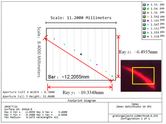 The off-axis arrangement greatly influences the laser tuning range and accuracy. We optimize the off-axis angle γ of the echelle grating (79 line/mm) for the laser system. According to Equation (5), m = 15 and λ = 1550 nm are selected as the calibration blazed wavelength, and the corresponding γ under the quasi-Littrow condition is calculated as 18.05°. Using Zemax OpticStudio software, we design the optical system to analyze the beam distribution on the DMD surface. The simulation results illustrate the length of the two-dimensional dispersion strip is 12.2 mm in Figure 4, matching with the experimental pattern in the inset of Figure 4. The 0.55″ DMD receiving wavelength range is around 20 nm from 1540–1560 nm and is limited by the DMD size. The tuning accuracy of the laser wavelength is 0.0177 nm/pixel, in theory. Considering the used echelle grating has a wide working range from UV to 25 μm, this laser system is convenient to be extended in the 2 μm-band, which has potential applications in the biomedical domain [14,15].