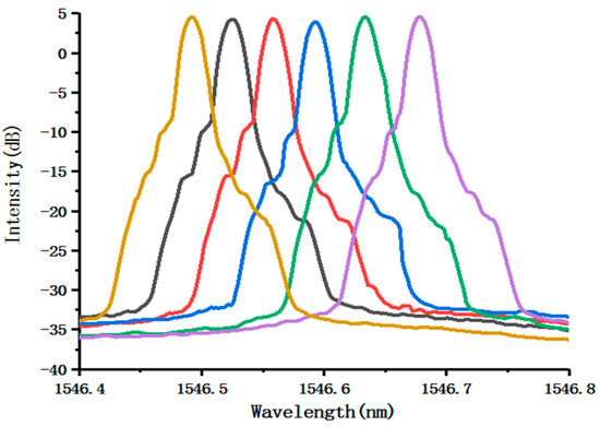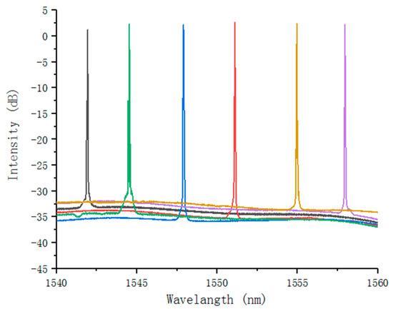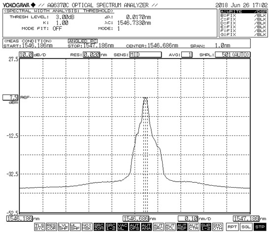 When the optical loop is closed, Figure 5 shows a typical laser signal with the center of the wavelength at 1546.733 nm when the pump power is 120 mW. The power of the laser output is around 7.5 dBm, the 3 dB-linewidth is less than 0.02 nm (limited by the resolution of the YOKOGAWA spectrum analyzer, Yokogawa Test & Measurement Corporation, Tokyo, Japan), and the SMSR exceeds 40 dB.