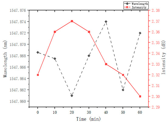 Figure 8 shows the drift of wavelength (dotted line) and the fluctuation of peak power (solid line) at the pump power 40 mW during 1-h observation at the center wavelength of 1546 nm. The maximum wavelength drift is less than 0.013 nm and the maximum peak power fluctuation is 0.07 dB at room temperature. The linewidth is better than that reported in [5] (0.05 nm) and [8] (0.02 nm), and the maximum peak power fluctuation is better than that in [8] (0.25 dB). Compared with other tunable lasers with the same tuning mechanism, the laser output stability has been further improved.