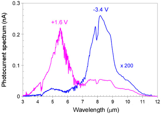 Photocurrent spectra of the dual-band QDIP under bias voltages of −3.4 V (blue trace) and +1.6 V (pink trace). The negative bias gives the LWIR band, whereas under the positive bias, the MWIR band dominates.