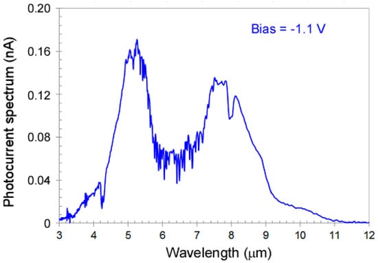 Photocurrent spectrum of the dual-band QDIP under bias voltages of −1.1 V. At this bias, the QDIP covers both the MWIR and the LWIR bands.