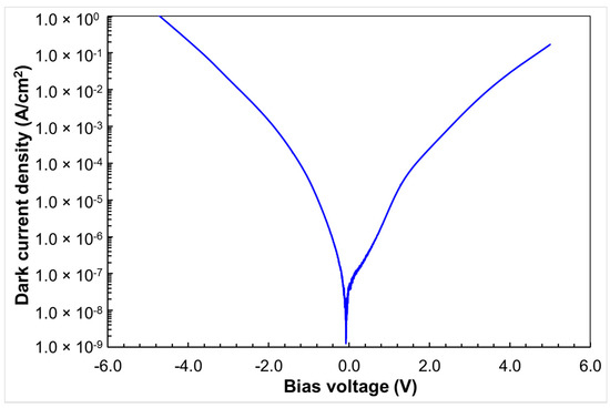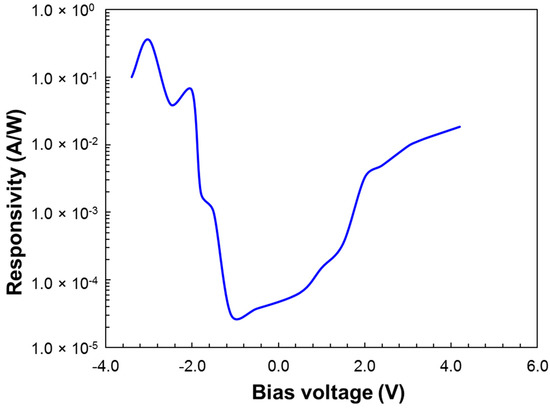 The dark current (Id) of the dual-band QDIP was measured using a Keithley source meter. Figure 5 shows the dark current density Jd at different biases measured at the device temperature of 77 K. The noise current (inoise, in units of A/HzP1/2P) was characterized using a low-noise current preamplifier (Stanford Research Systems, Sunnyvale, CA, USA) and a fast Fourier transform (FFT) spectrum analyzer (Stanford Research Systems, Sunnyvale, CA, USA). To avoid 1/f noise contributions, the noise current (inoise) was determined at 597 Hz.