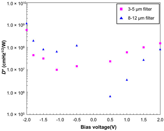 Figure 7 shows the calculated photodetectivity (D*) at different bias voltages with the 3–5 µm (square) and 8–12 µm (triangle) band pass filters. The 8–12 µm band has a higher photodetectivity (D*) at negative biases, whereas the photodetectivity D* of the 3–5 µm band is higher at positive biases. The photodetectivity D* differences indicate good band selectivity by direct bias voltage control.