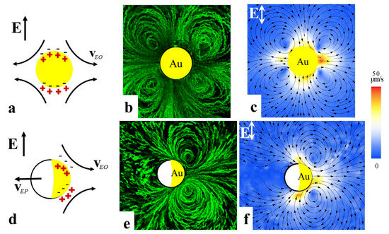 Induced-charge electro-osmosis (ICEO) around an immobilized gold sphere (a–c) and a Janus glass-gold sphere (d–f) as established by Peng et al. [14]. (a,d) Scheme of charge separation in presence of the electric field; (b,e) Experimental flow patterns driven by an AC field and visualized by fluorescent tracers; (c,f) Velocity fields; note quadrupolar symmetry of flows around the metal sphere in (b,c) and broken left-right symmetry of flows around the immobilized Janus sphere which acts as a pump; the flows are stronger on the Au (right) side than on the glass (left) side of the sphere in (e,f) [14]. Adapted with permission from [14].
