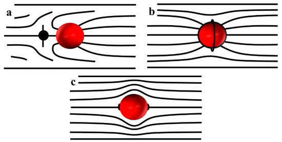 Concrete geometry of director distortions around large spheres of a radius depends on the type of surface anchoring. If the surface anchoring requires the director to be perpendicular to the surface, such a sphere, when placed in an otherwise uniform nematic, would produce a distorted director with a point defect, the so-called hyperbolic hedgehog, which serves to match the local radial director and the uniform far-field director [31], Figure 2a. The structure is of a dipolar symmetry. The hedgehog has an equal probability to be of the left or right side of the sphere. The structure can be characterized by introducing an elastic dipole vector directed from the hedgehog toward the sphere. When the sample thickness is comparable to the diameter 2 a, or when there is an electric or magnetic field applied to align the director, the hyperbolic hedgehog transforms into a disclination ring around the sphere [32,33] (Figure 2b). A sphere with tangential anchoring in the uniform nematic produces a configuration of quadrupolar symmetry with two surface point defects-boojums at the poles (Figure 2c). As will be described below, colloids with dipolar and quadrupolar symmetry show very different dynamics in an external electric filed.