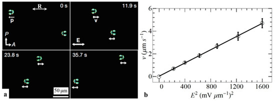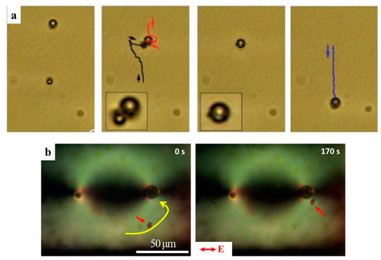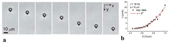 In presence of a uniform electric field, dielectric (glass) and metal (gold) spheres with a dipolar structure shown in Figure 2a become electrophoretically active in a LC, moving with a speed that grows with the square of the electric field, (Figure 3) [34]. If the LC is melted into an isotropic phase by heating, this effect disappears, as the glass spheres show only a linear electrophoresis, while the gold spheres do not move at all [34].