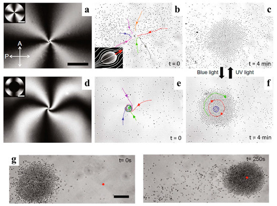 LCEP shows interesting features in terms of collective behavior of colloidal particles. In particular, Sasaki et al. [38] demonstrated that single particles and multi-particle self-assembled chains, including chains with an embedded micro-cargo, can be transported through the LC medium by combining LCEP and electrohydrodynamic convection. Another remarkable collective effect of “swarming” was demonstrated by Sagués’ group [39,40,41]. The particles in the experiments were of a pear-like shape. This shape assures that the symmetry of the director field is dipolar even if the surface anchoring of the director is quadrupolar. The particles are thus LCEP-active. The LC cell is bounded by a substrate with a photosensitive substrate that can be tuned to yield a planar anchoring under an ultraviolet (UV) (365 nm) irradiation and a perpendicular (called also homeotropic) anchoring under visible light (455 nm) irradiation. The initial state of the LC cell is homeotropic and the LC is of a negative dielectric anisotropy. Illuminating the cell with a UV light realigns the LC molecules parallel to the photosensitive plate. The director forms a radial structure seen as a Maltese-cross texture under a polarizing microscope (Figure 5a). When the electric field is applied, it reinforces the tangential alignment and also drives the pear-like particles towards the center of the pattern, forming an aster-like assembly (Figure 5b,c). This radial structure can be transformed into a spiral one, by shining a blue light at a small central region to enforce a homeotropic alignment. When the electric field is applied, the resulting structure is of a spiral type, combining splay and bend deformations (bend elastic constant is smaller than the splay elastic constant in the material explored [39]) (Figure 5d). The particles driven by LCEP to the center region assemble into a rotating vortex (Figure 5e,f). Even more intriguing, the aster and spiral clusters of colloids can be moved anywhere in the plane of the LC cell, by changing the location of the UV spot (Figure 5g [39,41]). All these properties allow one to design and address dynamically reconfigurable 2D lattices of clusters [39].