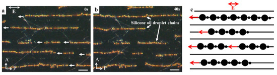 Another interesting example of collective dynamics powered by LCEP is shown in Figure 6 for a phase-separated dispersion of silicone oil droplets in a nematic LC. When a nematic LC material E7 is doped with a small amount (1 wt%) of silicone oil (from Sigma-Aldrich, St. Louis, MO, USA) and heated above its melting temperature, to 75 °C for 2 min, the oil and LC form a homogeneous mixture. When the sample is quenched to the room temperature, a biphasic region appears, with the oil droplets nucleating within the LC environment and growing till some critical radius . Further growth of the droplets is hindered, since the director field around them becomes distorted and produces hyperbolic hedgehogs; these distortions around neighboring oil droplets repel each other and prevent coalescence [42]. If the LC medium is uniformly aligned, one observes periodic arrays of linear self-assembled chains of oil droplets [42,43], Figure 6. When an AC electric field (E = 30 mV/μm, frequency 5 Hz) is applied to such a system, LCEP moves the chains to one side of the chamber, as specified by the polarity of the structural dipoles (Figure 6a–c).