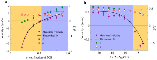 Sign reversal of LCEP velocity by changing anisotropic permittivity of LC 5CB-HNG 715600-100 mixture, demonstrated by Paladugu et al. [36]. (a) Dependence of LCEP velocity, anisotropic permittivity and conductivity on the concentration of LC one component, 5CB; and ; (b) Dependence of LCEP velocity, anisotropic permittivity and conductivity on temperature. Adapted with permission from [36].