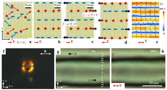 LCEO in an LC electrolyte with a predesigned director. Ticks represent local director visualized by LC PolScope: (a) An electric field drives “+” and “−“ electric charges along the x-axis but because of the anisotropic conductivity, the charges shift also along the y-axis, (b) Creating separated lanes of space charges; (c) The electric field moves the charged clouds along the x-axis; (d) Reversal of the field changes polarity of charges but does not change the Coulomb force; (e) An AC field of frequency 5 Hz creates lanes of LCEO flows of alternating direction; (f) Polarizing microscopy texture of a polystyrene sphere with tangential anchoring and bipolar director field; (g,h) Time sequence of AC-driven LCEO flows carrying polystyrene spheres with tangential surface anchoring. Parts (a–e) and (g,h) are adapted with permission from Peng et al. [26].