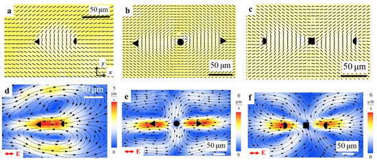 In classic linear electrokinetics, the fluid velocity is proportional to the electric field and the resulting flows are irrotational, . For practical applications such as mixing, flows with vortices are desirable [59]. Vortices are very easy to produce by LCEO in patterned LC cells, by using localized surface patterns, for example, with topological defects. The topological defects offer yet another degree of freedom in manipulating colloids as they can be used for entrapment and release [60,61,62]. Director patterns with pairs of disclinations of strength (m = ½, −½) and triplets such as (m = −½, 1, −½) and (m =½, −1, ½) (Figure 10a–c) produce LCEO vortices once an AC electric field is applied (Figure 10d–f). The defect pair in Figure 10a acts as a pump, pumping the LC from ½ defect towards the −½ defect. The triplet (−½, 1, −½) in Figure 10b produces a flow of the “pusher” type, with the fluid moving from the central +1 defect towards the two −½ disclinations at the periphery (Figure 10e) while the triplet (½, −1, ½) (Figure 10c) produces a “puller” flows (Figure 10f). The reason is that the LCEO flow velocities are linearly dependent on the director gradients.