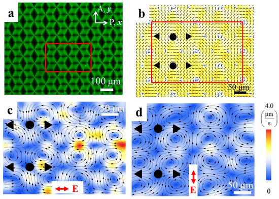LCEO with surface patterned two-dimensional lattice of topological defects [26]. (a) Polarizing microscopy texture of a periodic array of disclinations; (b) PolScope texture of the area indicated in part (a); (c) Corresponding velocity field of LCEO flows in the region marked as red rectangle in (b) caused by the AC electric field along the x-axis; (d) Corresponding velocity field of LCEO flows caused by the AC electric field acting along the y-axis in the same region. Adapted with permission from [26].