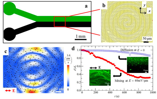 Micro-mixing in a Y-junction microfluidic device with photo-patterned director distortions demonstrated by Peng et al. [26]. (a) Y-junction with a photo-imprinted mixing pad (red square) that combines the LC with fluorescent particles (green) and pure LC (black); (b) PolScope texture of the mixing pad; (c) Velocity maps within the mixing pad caused by an AC electric field; (d) Comparison of mixing efficiencies of passive diffusion and LCEK. Adapted with permission from [26].