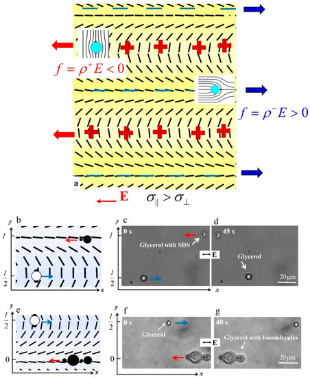 which forms an alternating regions of deformation of splay and bend along the y-axis (Figure 14a). Consider two types of spheres in such a pattern, one with a tangential anchoring and one with a perpendicular anchoring, in such a patterned nematic. As demonstrated in Refs. [69,80], the tangentially anchored spheres accumulate in the bend regions, while the perpendicularly anchored spheres move towards the regions of splay, as shown in Figure 14a. The reason is that these placements reduce the overall energy of elastic deformations of the director. If there is no electric field, the spheres of different surface anchoring thus would be separated along the y-axis. By applying a horizontal electric field that triggers LCEO, they can be also moved toward the opposite ends of the chamber along the x-axis. In presence of the electric field, the periodic director in Equation (5) serves to separate the charges; for the direction of field shown in Figure 14a, the positive charges accumulate in the regions of bend, the negative charges accumulate in the regions of splay. Reversal of the field polarity reverses the polarity of charges, but the Coulomb force preserves its sign, as in the other examples of LCEK considered above. As a result, the LCEO flows in the splay regions carry the spheres with the perpendicular anchoring to the right and the flows in the bend regions carry the spheres with tangential anchoring to the left. Note that the effective viscosity along the bend and splay regions is somewhat different, because the flow is parallel to the local director in the splay regions and perpendicular to it in the bend region. The pre-designed pattern in Figure 14a thus serves dual functions. First, it separated the colloids along the y-axis thanks to the elasticity of the nematic and second, it separates the colloids along the x-axis by the LCEO flows.