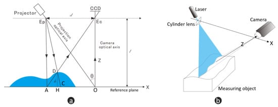 Schematic drawings of fringe projection and laser stripe scanning. (a) basic light path of Fringe projection profilometry system; (b) schematic diagram of laser stripe scanning system.