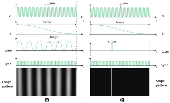 Controlling signals of pattern projection. (a) controlling signal of fringe projection; (b) controlling signal of stripe projection. H and V are the horizontal and vertical driven signals of the MEMS micromirror. is the row sync signal. is the modulation signal of the laser diode (LD).