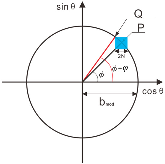 In fact, we modulate the phase by changing the grayscale of the projection images. Here, we would like to discuss how the grayscale affects measurement accuracy. In the N-steps phase shifting method, the phase shifting noise caused by random noise is determined by and the distribution of . We assume that this part noise , as shown in Figure 4, where the complex plane represents the phase calculated by an imaginary part and a real part. If point P is a measurement point, the coordinates of Point P are . Due to the noise , P will and change within the blue square (Figure 4), which has a side length of . If , then P will shift to Q and P will have a maximum phase error of . If we assume that the phase of P is , then the phase of Q can be given by