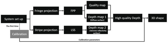 Fringe projection profilometry (FPP) is considered one of the most popular approaches because of the advantages of non-contact operation, high accuracy and full-field acquisition [10,11]. In FPP, sinusoidal fringes are projected onto a measuring surface by using a digital projector. Meanwhile, the observation pattern images are obtained from another angle using a camera. We can decode the height of the surface by analyzing the distortion of the observation fringe patterns [9,12,13]. However, FPP assumes that the measuring surface exhibits a diffuse reflection and usually considers low-reflective (dark) and highlighted (specular reflection) areas as outliers. These regions can completely block any fringe patterns, which results in the loss of depth information [14,15,16]. To address this problem, some solutions are presented. In [17], Salahieh et al. propose a multi-polarization fringe projection (MPFP) imaging technique that handles high dynamic range (HDR) objects by selecting the proper polarized channel measurements. A similar polarization solution is also adopted in [18]. On the other hand, Liu et al. demonstrate the use of a dual-camera FPP system, which can also be considered as two camera-projector monocular systems. By viewing from different angles, these highly specular and dark pixels, which are missing from binocular reconstruction, can be filled in [19]. In addition, Jiang et al. [20] present using 180-degree phase-shifted (or inverted) fringe patterns to reduce the measurement error for high-contrast surfaces reconstruction. Some other researchers have attempted to adjust the parameters of the camera and projector to handle the surface with large reflection variations. Lin et al. [21,22] suggest adjusting the maximum input gray level of projecting image globally, while Chen et al. [23,24] proposed adjusting projecting images pixel-by-pixel. In [16,25], the author proposes projecting a set of fringe images that are captured with different exposures. For [16,21,22,23,24,25], the reflection of the surface needs to be calibrated first. Then, by fusing these images captured with different parameters, a new fringe pattern with fewer saturated regions can be obtained. Although Jiang et al. [16,20,21,22,23,24,25] improve the performance without adding any extra equipment, they need to project or capture a lot of images when the measuring surface has very complex reflection variations. On the other hand, these approaches still use an FPP principle, which can be ineffective for extreme reflection areas.