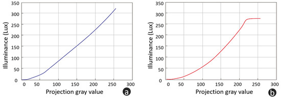 In FPP, the nolinearity, which makes ideal sinusoidal waveforms nonsinusoidal, can significantly influence the performance [40]. Due to the use of a laser source, the proposed system has better linearity than a conventional LED based pattern projector. To verify the linearity of these two kinds of projectors, a commercial projector (coolux S3) is chosen as a comparison, which is an LED based DLP projector. Both projectors project pure white images with different gray levels. Then, an illuminometer is used to measure the illuminance with a fixed distance. Figure 7a,b illustrate the relationship between the projection gray value and illuminance of the proposed system and a commercial LED projector. As is shown in Figure 7, the proposed system has better linearity than a commercial LED projector. In fact, these two curves give luminescence characteristics of laser source and LED source. Therefore, gamma calibration, which is usually applied to eliminate the influence of nonlinearity in FPP [40], is no longer needed.
