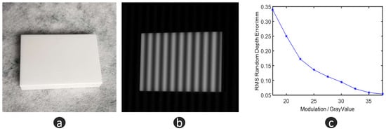 To find the relationship between fringe modulation and measurement accuracy, we set the modulation of the projected fringe pattern as different values to obtain the related uncertainty. Figure 8a is the standard gauge block. Figure 8b is the standard gauge block with the fringe pattern. Figure 8c illustrates the relationship between the modulation of the captured fringe pattern and measurement error. Obviously, lower modulation results in higher measurement error.