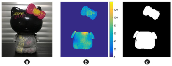 Measuring object and intermediate data. (a) measuring object; (b) quality map from FPP; (c) binary mask for data fusion.