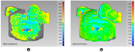 In this section, a black porcelain doll is chosen as our measuring object—see Figure 9a. For a black porcelain surface, the normal direction has a strong influence on the reflection. Weak reflection can be observed in most regions. When the normal direction is towards the camera, extremely strong reflection will be captured. This makes it difficult for FPP to work well. As a comparison, we paint the body of the doll with developer, which makes the body an ideal diffuse surface. Figure 9b is the quality map, where the threshold is 25. Figure 9c illustrates the fusion mask. Guided by the mask, we fuse the depth of FPP Figure 10a with the depth of LSS Figure 10b, and then we obtain the optimal 3D shape information Figure 10c. From Figure 10, we can find that FPP gives better accuracy (body of doll), but it cannot handle large reflectance variations (head of doll). LSS shows high robustness with different reflectance (head of doll) but lower accuracy (body of doll). The fusion data combines the advantages of FPP and LSS. To evaluate the measurement data quantitatively, a 3D measurement instrument (see Figure 11a) with a resolution of ±5 µm, is adopted to offer the ground truth data (see Figure 11b). Because of the limitation of measurement range and efficiency, only the head of the doll is scanned. Then, the FPP reconstruction result and hybrid measurement result are registered with ground truth data to compute the 3D geometric error, respectively. As illustrated in Figure 12a, for FPP data, the root mean square (RMS) error is 0.0991 mm, and 0.0713 mm for hybrid measuring results in Figure 12b. In this case, integrity is computed to evaluate the robustness. For FPP, it is 54.48% taking hybrid results as the reference (100%). The experiments show that the proposed hybrid approach gets an improvement of 0.0278 mm in accuracy and 83.55% in integrity under the conditions described in this paper.