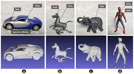 To verify the performance of the proposed approach, we chose several objects with large reflection variations that FPP cannot handle integrally. Figure 13a shows a plastic car model with shiny, dark and specular reflection regions. Figure 13b shows a metal surface. When the normal direction changes dramatically, it becomes hard to scan a metal surface. Figure 13c,d also show two difficult cases: stone material with very low reflection and a plastic surface with multiple reflectance and a large variation of normal directions. These results show the excellent performance of our approach.
