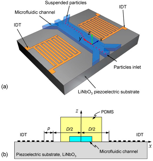 In order to study the acoustophoretic effects of suspended particles in the channel using the device, a two-dimensional cross section model of the device is considered as shown in Figure 1b. The constitutive law of a piezoelectric material can be expressed as follows [52,53]:
