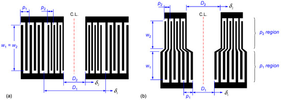 (a) Parallel and (b) series configurations of IDT designs for generating switchable dual-wavelength SSAW fields. In the parallel (series) IDT design, IDTs of two different pitches (denoted as p1 and p2) are connected in parallel (series).