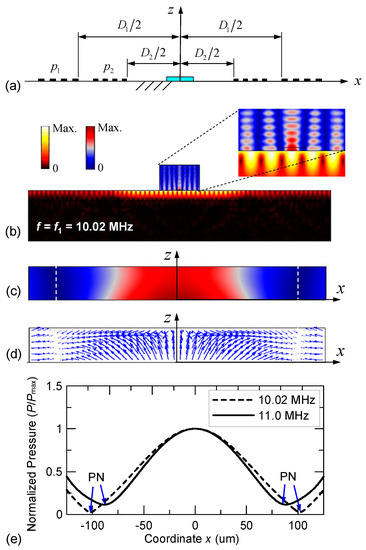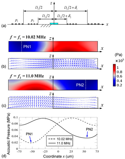 Figure 3a,b show the schematic of the symmetric two-pitch arrangement on the top surface of the LiNbO3 substrate and the simulated results. The frequency of the applied voltage is f1 = 10.02 MHz. At steady state, the two series of dual-wavelength SAWs simultaneously excited by the left- and right-hand IDTs interfere to produce SSAWs in the central region of the LiNbO3 substrate and radiate longitudinal waves into the PDMS and water domains to create a standing acoustic pressure field. Figure 3c,d show the calculated acoustic pressure and ARF fields in the water domain. The acoustic pressure field exhibits a symmetric profile with two acoustic pressure nodes (PNs) that correspond to two zero-force points in the symmetric ARF field. The force field also indicates actuating directions toward the pressure nodes. This reveals that the acoustic pressure nodes locate around the positions of the stationary points in the channel for the motion of suspended particles. Figure 3e shows the comparison of the variations of the acoustic pressure along the x direction and at the half height (i.e., at z = 12.5 μm) of the water domain when the frequency of the applied voltage is changed to f2 = 11.0 MHz. The symmetric acoustic pressure nodes are shifted towards the center (the z axis) by approximately 17 μm when the input frequency is changed from f1 to f2.