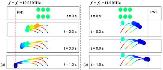 Calculated particle trajectories in the parallel IDT design using two different input frequencies: (a) f1 = 10.02 MHz and (b) f2 = 11.0 MHz. An array of six particles (8 μm in diameter) are released from the central region of the channel at time t = 0 s.