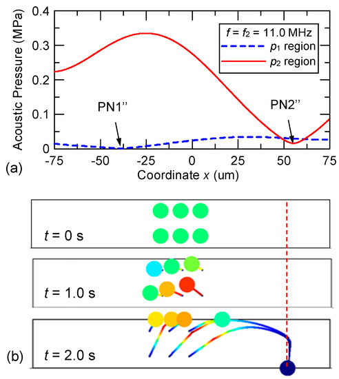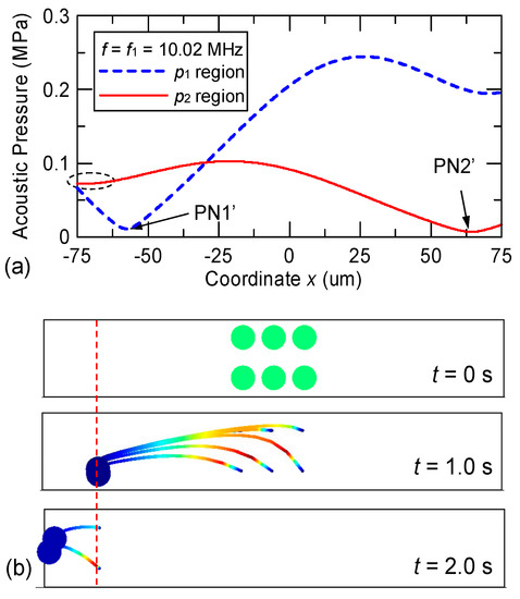 Figure 7 shows the simulated results when the frequency of the input voltage applied to the series IDTs is f2 = 11.0 MHz. Within the p1 region, the variation of acoustic pressure is mild and the intensity is low because of the ineffective excitation of 398 μm SAWs; the variation is indicated by the dashed line in Figure 7a where a pressure node (PN1′′) appears at the left side of the water domain. However, this pressure field produced by the non-target SSAWs in the p1 region was still able to drive the particles toward left; here we refer to this effect as “pre-actuation.” In order for the design to perform properly, the left displacement by the pre-actuation in the p1 region caused by the non-target SSAWs must be small enough so that the acoustic pressure of the p2 region will still be able to reverse the particles toward PN2.” As shown in the middle panel of Figure 7b, particles released in the p1 region are slowly driven toward PN1′′ during a time period corresponding to 1.0 s (pre-actuation). Then the particle tracing calculation is continued by assuming that the particles enter the p2 region at t = 1.0 s as a result of the continuous flow. In the p2 region, the 363 μm SAWs are effectively excited and result in a drastic pressure variation as shown by the solid line in Figure 7a. A pressure node (PN2′′) appears at the right side of the water domain and reverses the drift direction of the slightly-leftward-shifted particles so that they start to move toward PN2′′ as shown by the particle trajectories in the bottom panel of Figure 7b.