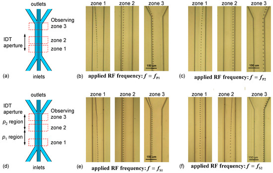 Even though the frequency difference ΔfP between fP1 and fP2 is as small as 0.88 MHz, Figure 8 shows that the two SAW resonance peaks are unambiguously distinguishable; and in Figure 6 and Figure 7, the corresponding non-target SSAWs in the design do not adversely affect the acoustic pressure nodes produced by the two SAW frequencies. Figure 9d–f, on the other hand, show the results of using the series IDTs, in which the SSAWs with frequencies fS1 and fS2 effectively work in the p1 and p2 regions, respectively, while the corresponding non-target SSAWs could be influential in the p2 and p1 regions, respectively. For f = fS1 [Figure 9e], the particles were driven to bend left toward PN1′ in zone 1 and move toward the left outlet. In contrast, for f = fS2 [Figure 9f], the particles were driven to PN2′′ and exited through the right outlet. When f = fS2, the particles evidently drifted rightwards until they entered the p2 region [see the image at zone 2 of Figure 9f] because of the ineffective SAW excitation in the p1 region. Even though the target and non-target SSAWs in the series IDT design are spatially separated, the ineffective excitation shown in Figure 6 and Figure 7 led to a much lower non-target SSAW intensity that, in turn, reduced the pre- and post-actuation influences.