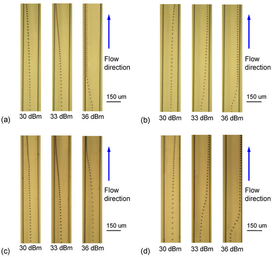 Experimental trajectories of the lateral displacement of a particle along the microfluidic channel with input RF power levels corresponding to 30 dBm, 33 dBm and 36 dBm in the design of parallel IDTs with input frequency (a) fP1 and (b) fP2; and in the design of series IDTs with input frequency (c) fS1 and (d) fS2.