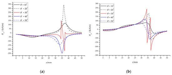 A slight change in angle will cause a large change in magnetic field strength and magnetic force. Regardless of the x-direction or the y-direction, the magnetic field strength at the center of the channel decreases on the left side of the permanent magnet and increases on the right side, as shown in Figure 6a,b. For example, the magnetic field strength in the x-direction of the left side is reduced from |−73.52| kA/m to |−53.63| kA/m, and the right side is increased from 73.52 kA/m to 100.74 kA/m when the angle θ = 10°. However, we found that there is a transition on the right side when the angle is increased to 30°; increasing the angle to 40°, the magnetic field strength in the x-direction turns to a negative value, and the y-direction decreases; and then increases the angle to 50°, the magnetic field strength in x- and y-direction continues to decrease.