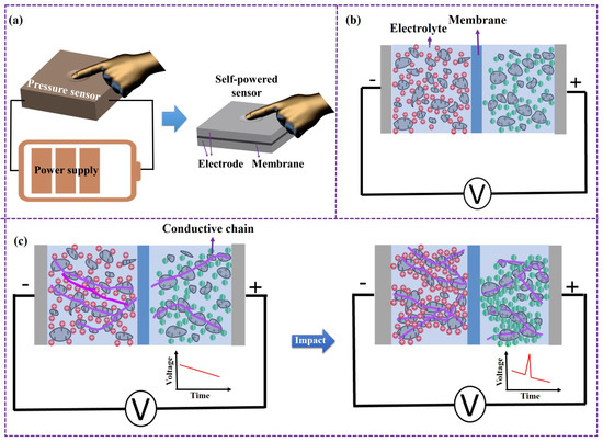 Traditional self-powered mechanical sensors applied in measurements of static pressure and dynamic impact are mainly piezoelectric sensors [10,11,12], some of which benefit from porous materials [13,14]. However, due to the inherent physical properties of piezoelectric crystals, high frequency oscillations in the sensitive signals under mechanical effects are unavoidable, and complex signal processing must be applied to obtain the features of the target (e.g., the number of impacts during a continuous impact process) [15,16]. These insurmountable shortcomings make it urgent to develop mechanical sensors based on new principles.