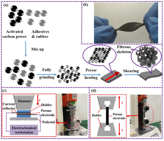 According to Equation (1), a larger porosity is critical to improve the piezoresistive performance of the porous electrode, so an electrode with loose microstructure is preferred. However, for normal carbon electrodes, the large porosity also results in weak mechanical strength of the electrode, making it easy to be broken under mechanical effects. In order to solve this contradiction, a novel preparation process is proposed, forming an elastic micro-networked structure with polytetrafluoroethylene and achieving superior piezoresistive performance and elasticity simultaneously. The specific steps of the film preparation process are as follows (Figure 2a):