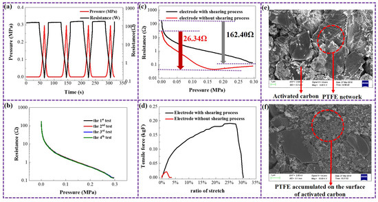 Changes in the microstructure and macroscopic properties of the porous electrodes by a shearing process. (a) Resistance change of the electrode during four consecutive pressurization– depressurization processes. (b) Repeatability of electrode piezoresistive characteristics during four consecutive pressurization–depressurization processes. (c) Piezoresistive characteristics of the electrodes with and without the shearing process. (d) Elasticity of the electrodes with and without the shearing process. (e) Electron micrograph of the electrodes with the shearing process where PTFE is the abbreviation of polytetrafluoroethylene. (f) Electron micrograph of the electrodes without the shearing process.