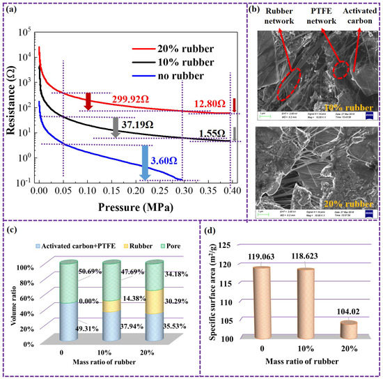 Although the increase in the rubber component can improve the piezoresistive characteristics of the porous electrode, it also causes a loss of its energy storage characteristics. As shown in Figure 4c, as the mass ratio of rubber increases, the volume ratio of the microscopic pores of the electrode decreases remarkably, resulting in a loss of specific surface area, as shown in Figure 4d. The loss of specific surface area means that the micro-interface of the electrochemical double-layer energy storage structure is reduced [25]: