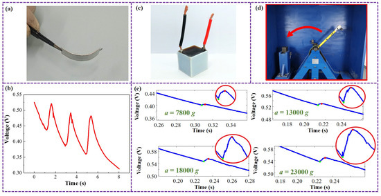 A picture of the self-powered impact sensor is shown in Figure 5c. Its impact sensitivity characteristics are tested by a Machete Hammer system which utilizes the potential energy of the counterweight to produce an ultra-high impact of up to 30,000 g, as shown in Figure 5d. The experimental results are shown in Figure 5e, The response signal of the sensor has a clear voltage peak when it is subjected to a high-g impact, with a wide range from 7800 g to 23,000 g. Considering that the impact process in practical applications is about 1 millisecond [26], the sampling rate for signal acquisition of the sensor is set as 50 kHz. The voltage peak has almost no clutter even at such a high sample rate, showing superior impact feature recognition ability over traditional piezoelectric sensors.