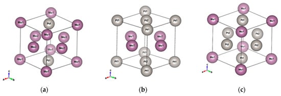The crystal structure and electronic structure of the alloys are important factors influencing the alloys’ material properties. Theoretically, it is predicted that the crystal structure of a bi-metal alloy remains the same as its constituted elements if the constituted elements have the same crystal structure. Boschow et al. [25] showed that Au92Ni8 exhibits the same space group, F3m3, as the constituent elements. However, some researchers have showed that the crystal structure can be reshaped and transformed into other crystal structure with an equal ratio of compositions and very different Bohr radii of elements. For example, Leroux [26] recorded the phase diagram of PtNi. It was shown that the crystal structure of PtNi alloy with an atomic ratio of around 0.5 is quite different from the crystal structures of Pt-rich or Ni-rich alloys. More complicated phase diagrams of bi-metal alloys can be found for constituted elements with two different structures. Ocken et al. [27] illustrated the phase diagram of PtMo from body-centered cubic (BCC) Mo to face-centered cubic (FCC) Pt. From the Inorganic Crystal Structure Database (ICSD [28]), it was shown that that AuTa alloy is of the F3m3 space group for Au0.9Ta0.1 but has a CsCl structure for Au0.5Ta0.5. For systematic discussions, we simulated the selected 12 alloys with I3m3 and F3m3 structures which may appear in nature. The snapshots of the PtxMo(1−x) F3m3 and I3m3 structures with different morphologies are shown in Figure 1 and Figure 2, respectively.