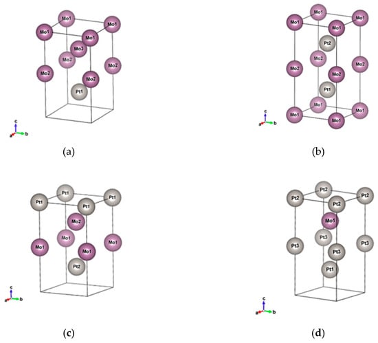 Snapshots of the PtxMo(1−x) I3m3 structures with different morphologies: (a) Pt0.25Mo0.75, (b) Pt0.5Mo0.5_mix, (c) Pt0.5Mo0.5_upper, and (d) Pt0.75Mo0.25.