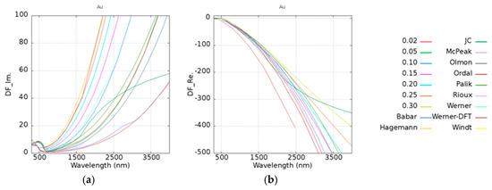 To determine the effect of , we took Au as an example. In Table 2, the damping frequency is shown to fit Drude’s model according to Blaber [40], Ordal [41], and Zeman [42]. For the comparisons, the damping frequency was calculated from 0.02 to 0.3 eV, and the experimental data of imaginary and real parts of dielectric constants are shown in Figure 3a,b. DF_Im. and DF_Re. along the y-axes in Figure 3 are denoted as the imaginary and real parts of the dielectric functions. It was found that the trend of Badar’s data [31] which has a fitting parameter with a value of 0.0184 eV, is similar to the calculated case of equal to 0.02 eV. Zeman’s [42] data was fitted by Hagemann’s [32] experimental results which are located between 0.05 and 0.1 eV. Although Hagemann only provided experimental data under 826 nm, the trend of this data is similar to that of our simulation data. Olmon et al. [35] discussed the relationship between the parameter and the permittivity of the different morphologies of gold in detail.