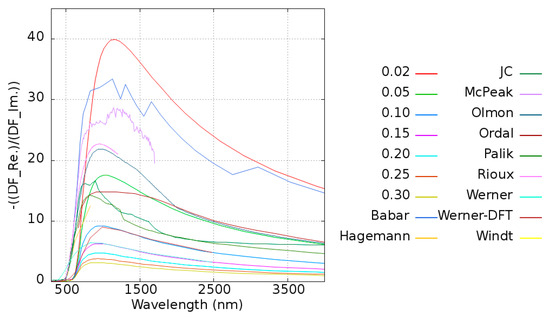 For a given material, a high Q means that it has less loss and a stronger resonance property for inducing plasmons in this frequency range. The Q of pure Au is shown in Figure 4. The maximum of Q is located at around 1100 nm, which is consistent with the experimental data [31,32,33,34,35,36,37,38,39]. Most of the experimental data’s are located between 0.02 and 0.1 eV. Considering the different metals employed in this work, the damping frequency is taken as 0.1 eV for all systems except pure Au.