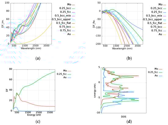 To inspect the optical properties of alloys, we took AuxMo(1−x) alloy as an example. The imaginary and real parts of the permittivity of AuxMo(1−x) alloy are shown in Figure 5a,b, respectively. In the legend of the plots in Figure 5, the first and the last ones characterize the pure metallic elements. The number represents the atomic ratio of Au, while the text after the number denotes the structure and the morphology under the given atomic ratio condition. For example, 0.25_bcc represents Au0.25Mo0.75 with a BCC structure. In the AuxMo(1−x) alloy, all cases possessed a higher imaginary part of the permittivity than pure Au and Mo above 1000 nm. In addition to intraband transition, the interband transition also has the contribution to the imaginary part of the permittivity. Here, Au0.25Mo0.75 (FCC) was taken as an example for further discussion. The permittivity contributed by the interband transition of Au0.25Mo0.75 (FCC), pure Au, and Mo is shown in Figure 5c, and the corresponding density of states (DOS) is shown in Figure 5d. The DOS for each case is normalized by the maximum value within the range of −10 to 5 eV. It was shown that the onset of interband transition is roughly consistent with the distance between the large quantity states and the Fermi level. For instance, it was shown that the first huge DOS peak below the Fermi’s level is around 2.5 eV in the case of Au (Figure 5d, blue line), whereas the occurrence of interband transition is around 516 nm. The combination of Au and Mo leads to additional states, which are known as the virtual states [20] and add the possibility of photon absorptions for the higher imaginary part of the permittivity.