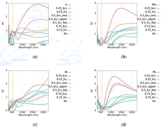 The results of Q of the Au-based alloy are shown in Figure 6. In the legend of the plots, the first and the last ones characterize the pure metallic elements. The number represents the atomic ratio ofe Au, while the text after the number denotes the structure and the morphology under the given atomic ratio condition. For example, in Figure 6a, 0.5_bcc_mix represents Au0.5Ir0.5_mix with a BCC structure. The extreme high Q of Au is not fully shown here, although it is given in Figure 4. A material which has a Q value lower than 1 may not be a good plasmonic material in such a frequency. Low-Q materials occur around the visible region in most cases, and this contributes to the relatively high real part of the permittivity and the onset of interband transition. Some cases even serve as a dielectric material; in other words, they have a positive real part of the permittivity, as shown in the Appendix A. Although some alloys possess lower imaginary parts compared to pure metal, such as AuIr and AuNi, it was found that alloys have a larger real part of the permittivity due to the reduction of the plasma frequency. This leads to a larger intraband transition, as shown Equation (1), causing the shrinking of Q. Most of the cases exhibited a smaller Q than pure metal, but there are still several instances that showed a good property of Q. For example, Au0.25Ir0.75 and Au0.75Ir0.25 had a better performance than pure metal at 600 nm and 800 nm of narrow band. The extremely low imaginary part of the permittivity of Au0.5Ni0.5 (FCC) was found even compared with other Au-based alloys and pure Ni. The real and imaginary parts of permittivities of Au-based alloy are shown in Figure A1 of Appendix A. It is not surprising that Au0.5Ni0.5 (FCC) showed a good performance above 3500–4000 nm. Au0.5W0.5 (BCC_mix) possessed a better Q performance than pure W around the near-infrared region at 1000 nm. On the other hand, manufacturing costs may be reduced by using different compositions. The prices of Au, Pt, and Ir remained in same order in 2018, being more expensive than Ni, Mo, Pb, Ta, and W. The raw material cost may be an important issue affecting the mass production of devices. The Q performance was larger than 1 in most of the Au-based alloys in the infrared region, indicating that these may be used in different applications.